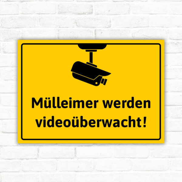Das Schild „Mülleimer werden videoüberwacht“ ist in den klassischen Farben Gelb und Schwarz gestaltet – eine Kombination, die weithin als Symbol für Warnung und Aufmerksamkeit bekannt ist. Der gelbe Hintergrund zieht sofort die Blicke auf sich und vermittelt, dass besondere Vorsicht geboten ist. Die schwarze Schrift, ergänzt durch das Kamera-Symbol, unterstreicht die Botschaft klar und unmissverständlich: Dieser Bereich wird videoüberwacht.